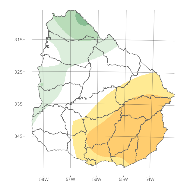 Los siguientes mapas muestran la situación espacial del Índice Estandarizado de Precipitación para diferentes escalas de tiempo. Colores verdes indican que la precipitación fue superior al valor normal del lugar para el período considerado, colores rojos indican que fue menor.