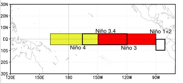 Regiones definidas de El Niño en el Océano Pacífico Tropical.