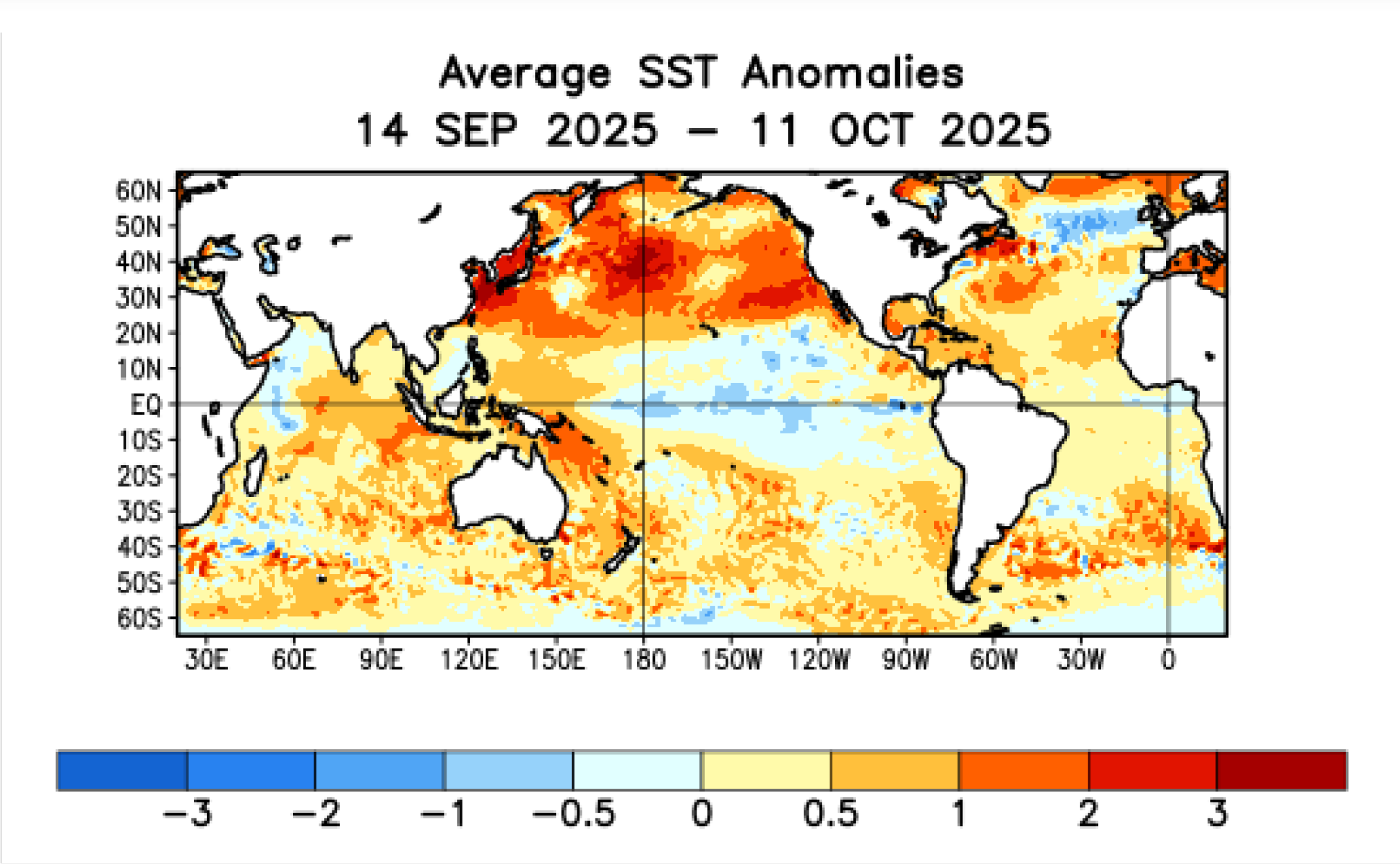 Anomalía (desvío respecto a la media) de TSM (del 7 de setiembre al 4 de octubre de 2025). Imagen tomada de