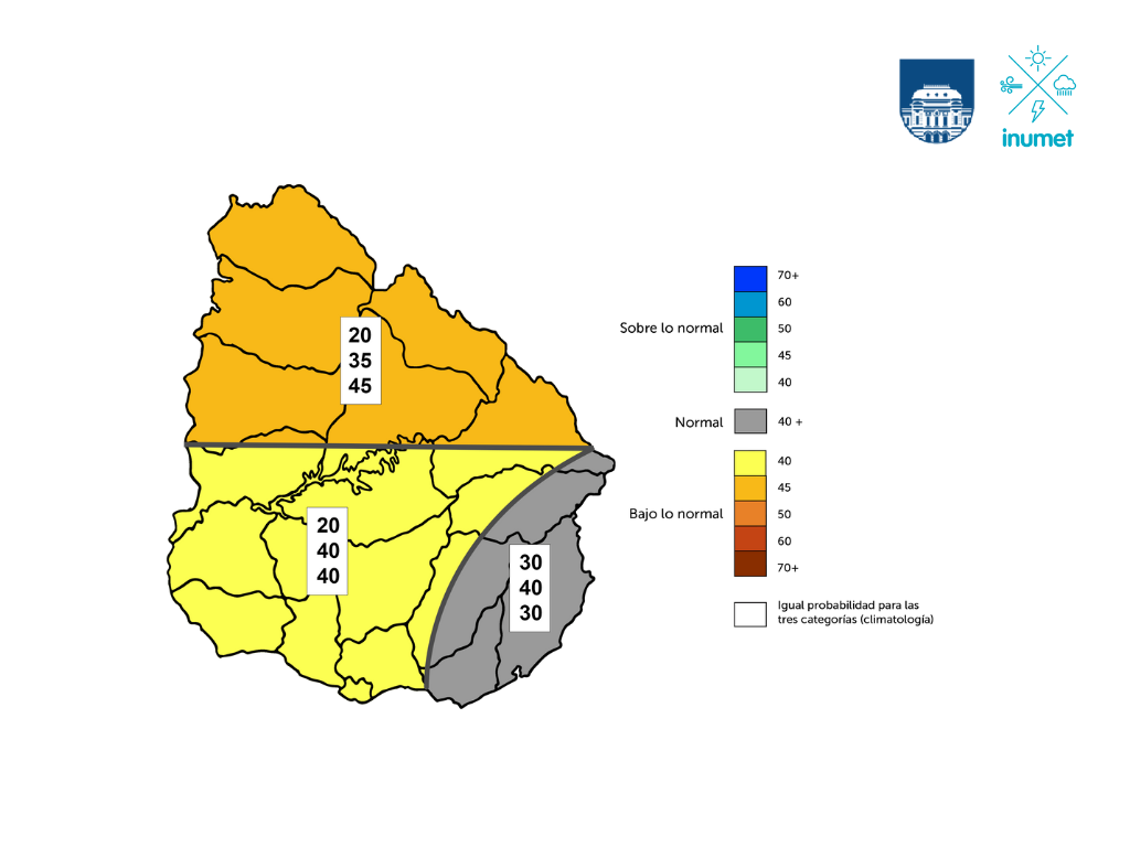 - En cuanto a la temperatura media, se divide al país en dos regiones, en las que se espera que durante el mismo trimestre esté normal y por encima de lo normal.